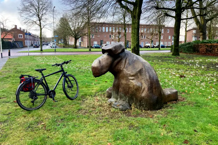 Soms kom ik met mijn bezorgronde langs een leuk bronzen beeld. Het is een hondje, het zit in het gras en heeft een berustende en ietwat oplettende houding. De vormen van het hondje zijn wat overdreven, vooral z’n snuit is nogal uit proportie, en dat geeft een grappig effect.